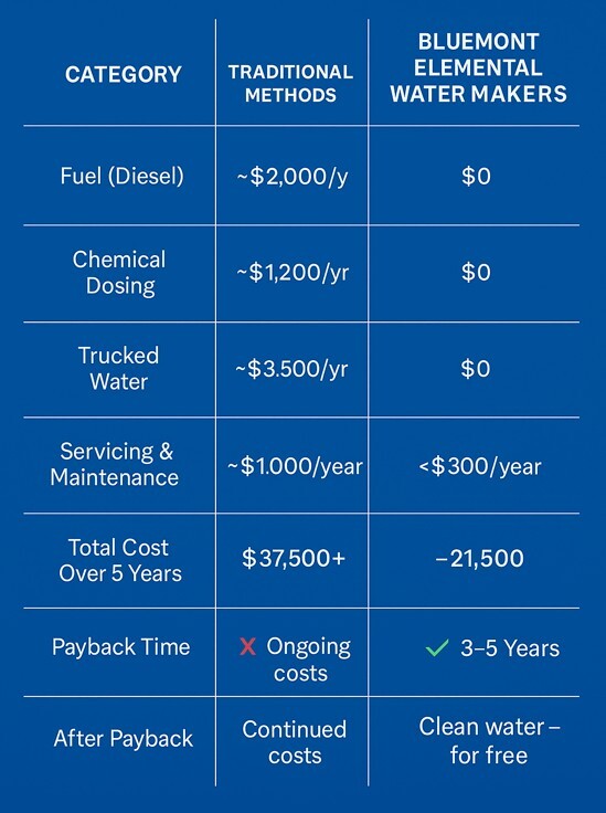 With freshwater supplies under pressure from erratic rainfall, overuse, and ageing infrastructure, the cost of securing reliable water keeps rising. Add concerns about chemically treated water, and the demand for affordable water solutions has never been higher. That’s where low‑maintenance solar desalination systems come in – not as a backup, but as a complete water solution. Bluemont’s Elemental Water Makers (EWM) deliver clean, safe, and reliable water using solar energy, with minimal upkeep and no chemicals or diesel.
