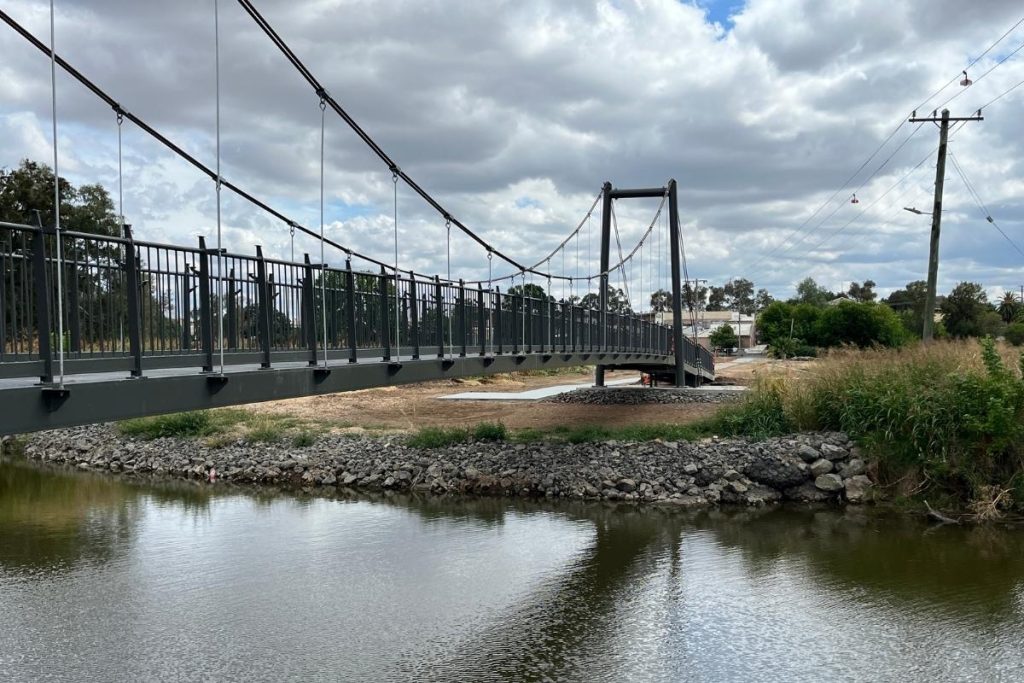 This original Swinging Bridge was a product of its time — built in the rock ‘n’ roll era of the 1960s, it stood strong for decades. But just like the styles of the past, infrastructure needs to evolve. After years of flooding and heavy water flow, this bridge and its river bank needed a serious modern makeover! Now, the bridge has been upgraded with modern scour protection, and it’s all thanks to Bluemont’s 2-tonne Rock Bags.