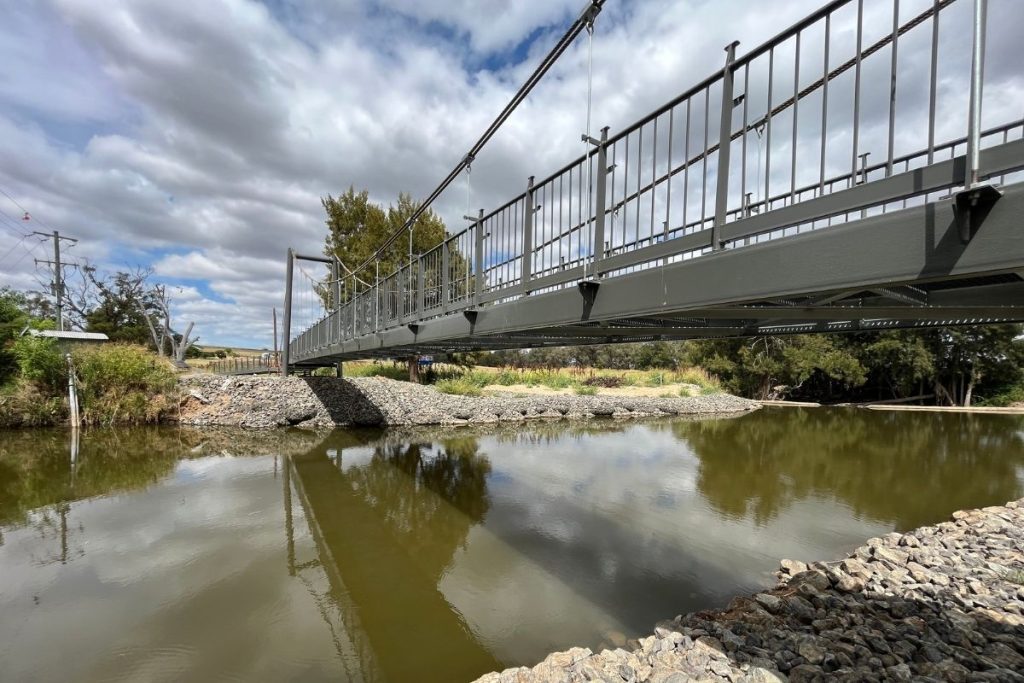 This original Swinging Bridge was a product of its time — built in the rock ‘n’ roll era of the 1960s, it stood strong for decades. But just like the styles of the past, infrastructure needs to evolve. After years of flooding and heavy water flow, this bridge and its river bank needed a serious modern makeover! Now, the bridge has been upgraded with modern scour protection, and it’s all thanks to Bluemont’s 2-tonne Rock Bags.